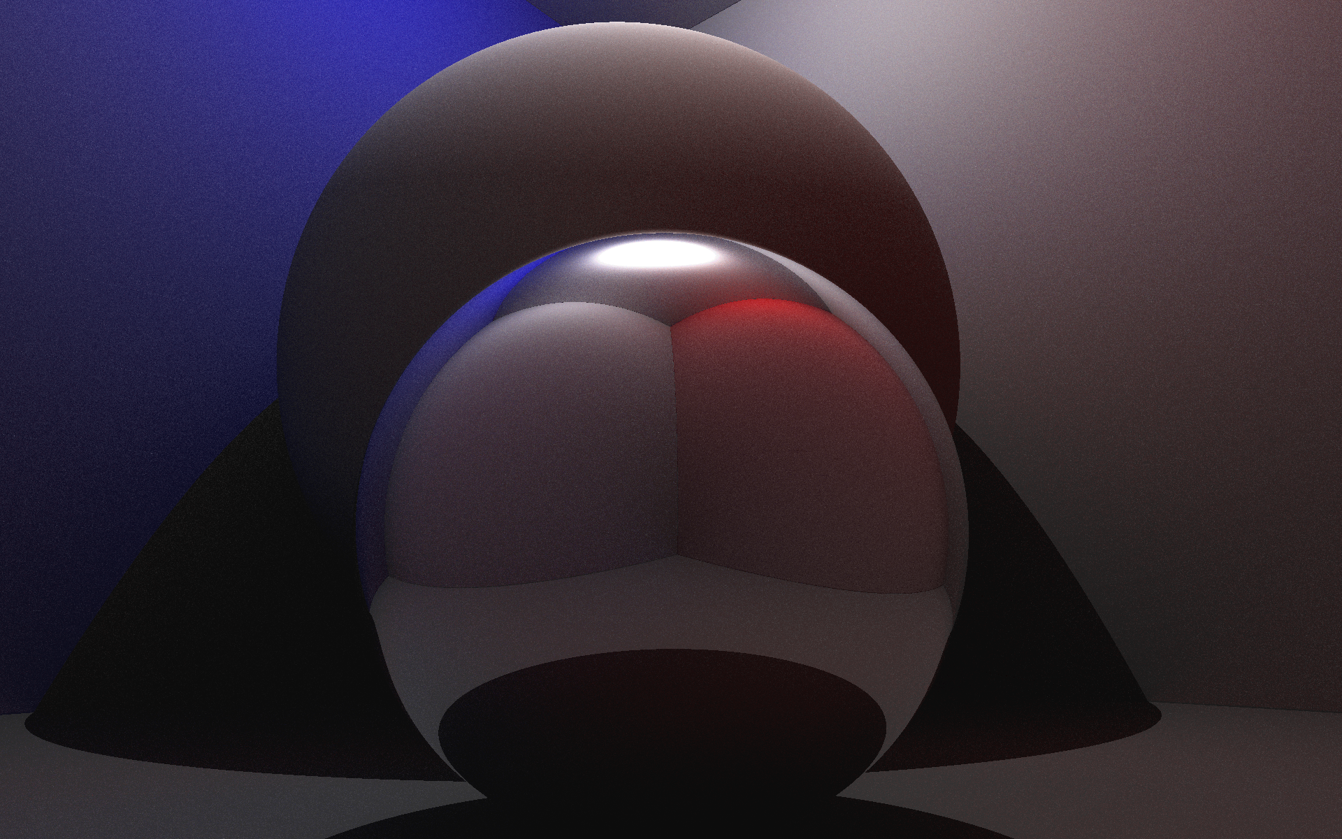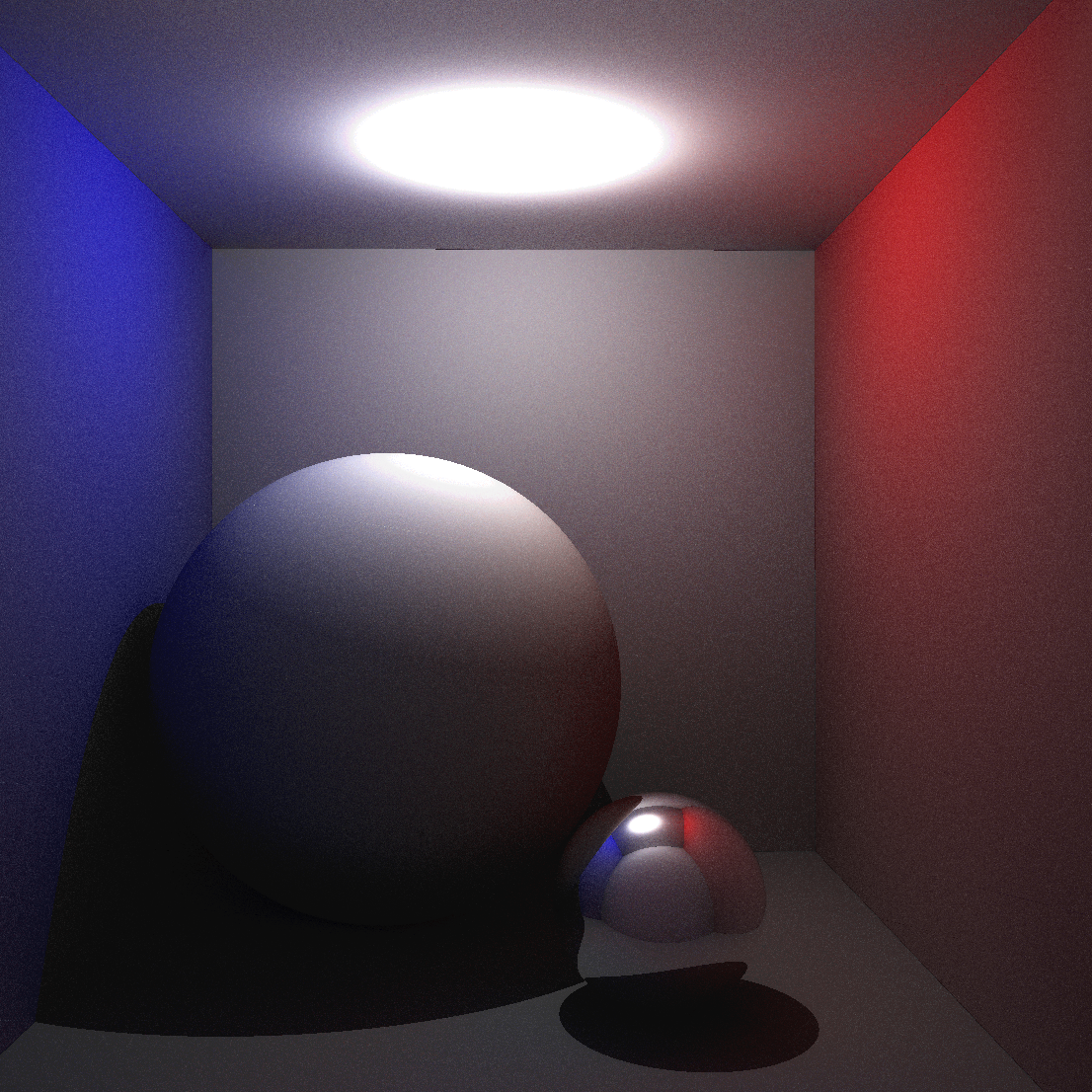 The default scene depicts the Cornell Box, a standard scene used to test rendering engines. This scene displays the results difficult rendering techniques such as GI and reflections. For instance, notice how light from the walls of the scene cause the large sphere to be partially blue and red.