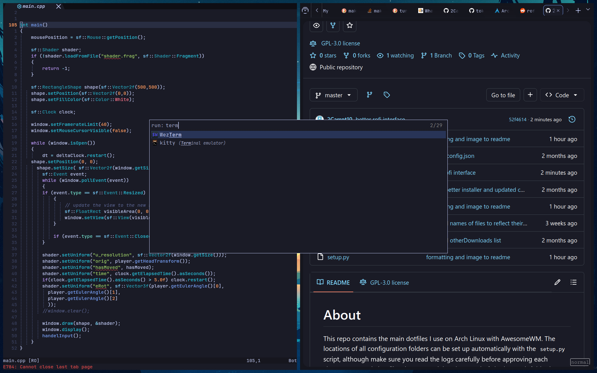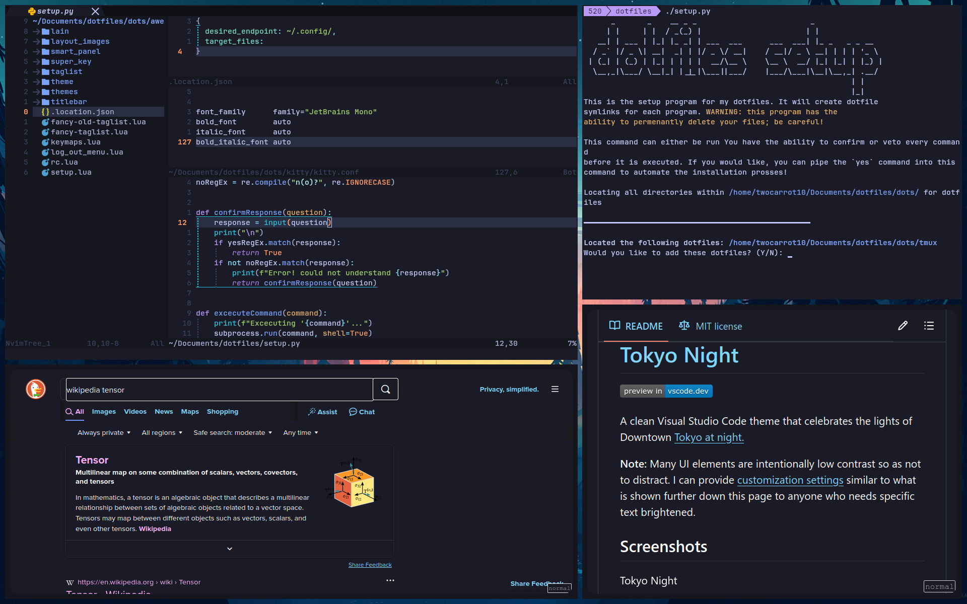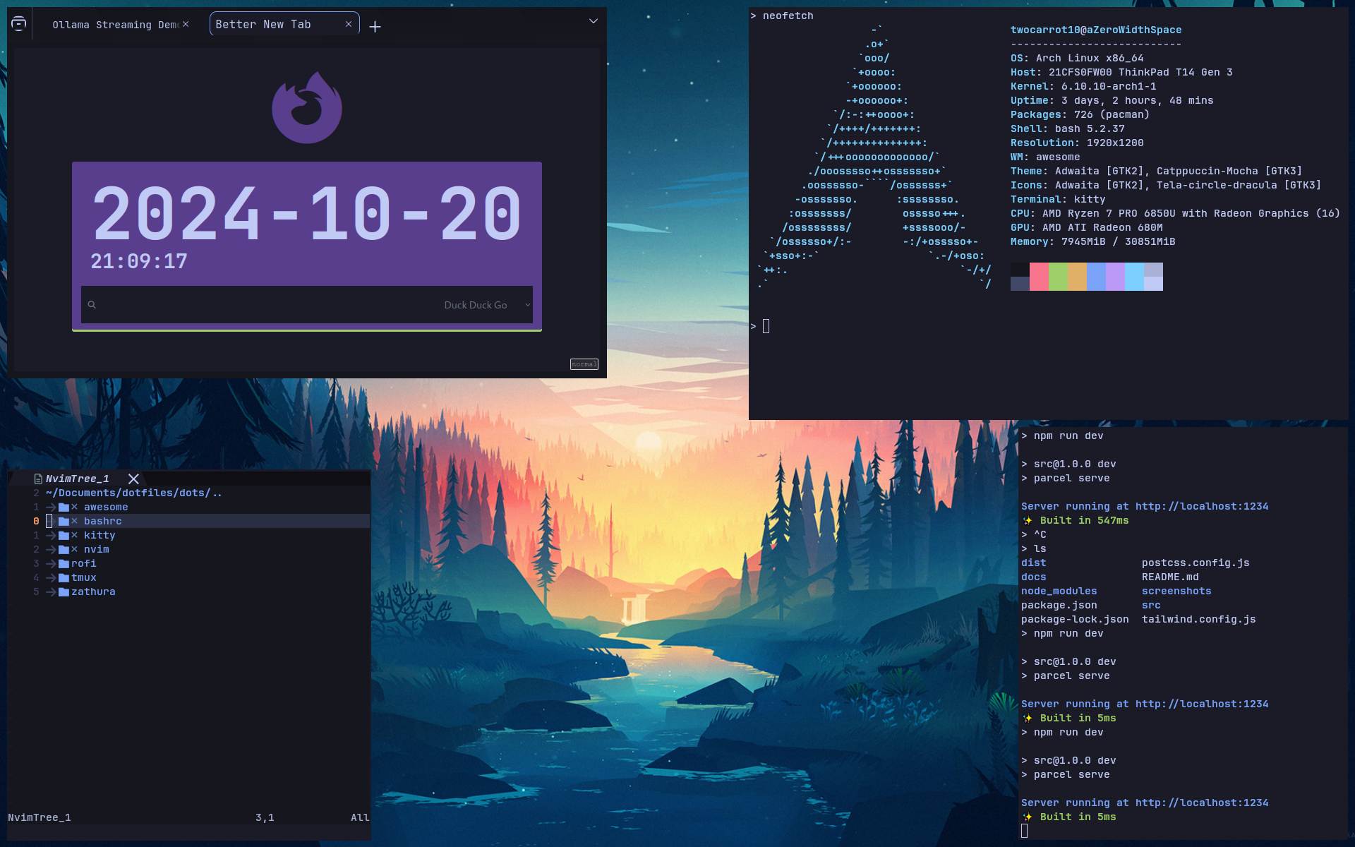 This project contains configurations for many different programs: AwesomeWM, Neovim, Rofi, Kitty, Bash, and Tmux. Together, these configurations modify every aspect of how the user interacts with the computer. These configurations increase my productivity by providing me with a clear, distraction-free, and predictable environment.