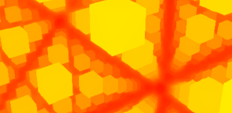 To better understand how this algorithm works, I designed a two dimensional demo. This demo makes it easy to visually ensure that the signed distance function is valid. The demo has helped solve some otherwise puzzling bugs. The concentric rings represent positions of equal distance to the closest object.