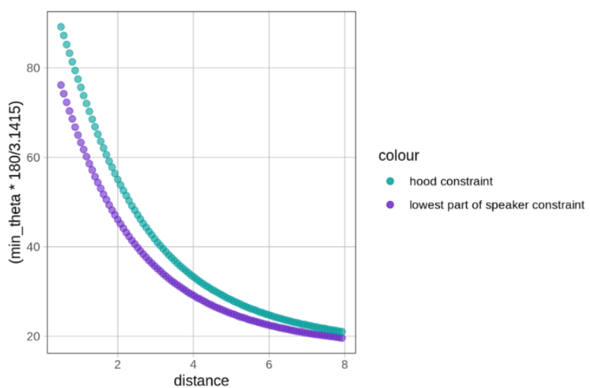 The polynomial curve is calculated based on 44 viable position-angle combinations. Any incorrect data could negatively influence the performance of the robot in competition, so the position of the robot was measured to sub-centimeter precision and the note trajectory through the speaker was recorded with a high-speed slow-motion camera to pick up on subtle variation that the human eye could not detect. Instead of accepting angles that cause the note to just go into the speaker, we made sure the angle caused the note to go perfectly through the center of the speaker. That way, even if unexpected variation caused the note to go off course, it will most likely still pass through the goal.